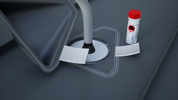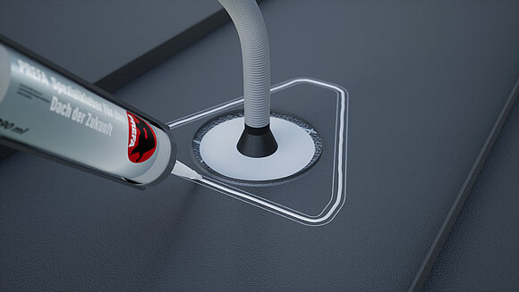 Appliquez de la colle spéciale tout autour et guidez le tuyau ondulé à travers le bec. Posez ensuite la chatière pour panneaux solaires et pressez-le au centre.