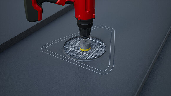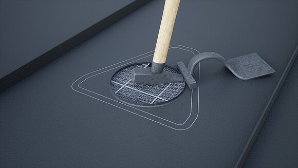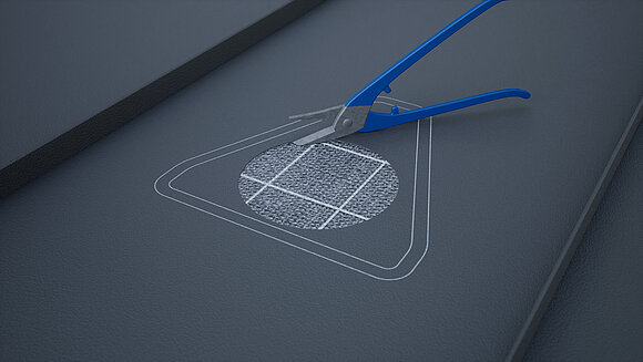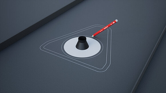 Positionner la chatière pour panneaux solaires et marquer le contour. Marquer ensuite la surface de collage (25 mm) et le contour du manchon de tuyau. Découpe et sertissage de la zone circulaire.