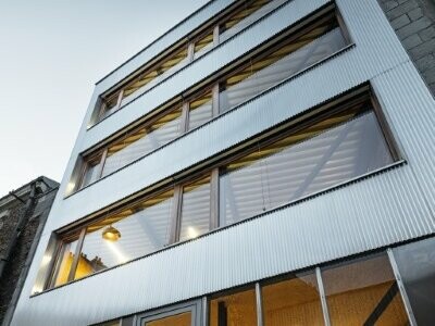 Nella Rue Marmontel di Nantes (Francia) gli architetti François Dussaux, Aurélien Lepoutre e Vincent Wattier, dello studio DLW architectes, hanno lasciato il segno firmando una sede per uffici che non passa inosservata. La struttura, sottile e leggera, risalta soprattutto per la facciata, rivestita in alluminio naturale con 80 m² di profilo a zeta PREFA. Dovendo seguire un imperativo di semplicità per quanto riguarda la costruzione, la suddivisione degli spazi e l’illuminazione, al pianterreno la pianta prevede soltanto un deposito per biciclette, una sala sociale, un vano per la circolazione verticale e un cortiletto. La facciata è lineare, priva di aggetti o rientri, ma dotata di un rivestimento in profilo a zeta PREFA, applicato con fissaggi invisibili, che con il variare della luce del giorno sembra cambiare colore. L’edificio sorge nell’antica area residenziale e commerciale di Nantes, a metà strada fra il centro storico e la Loira.