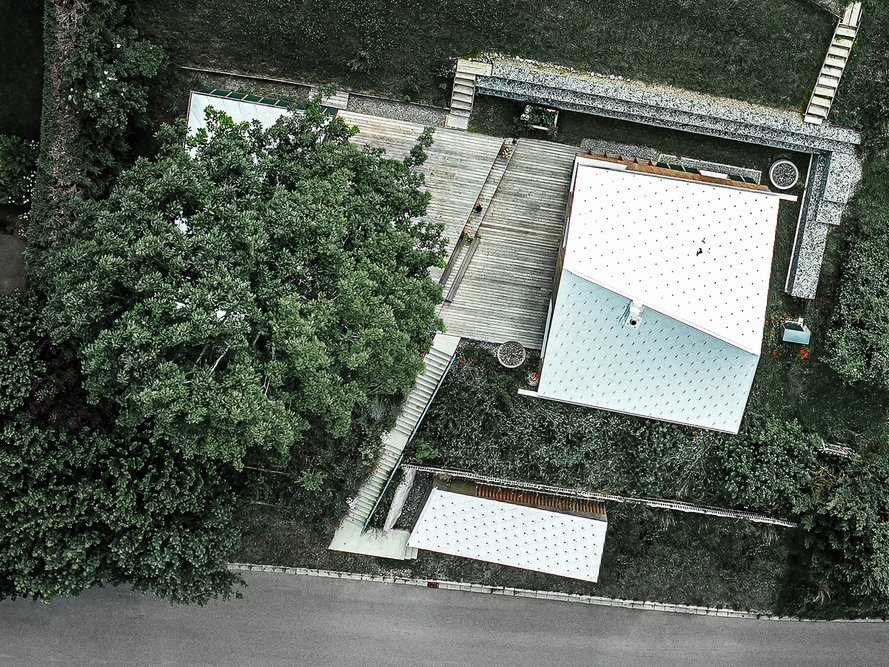 Katja Knaus e Benedikt Bosch dello studio di architettura Yonder hanno realizzato su un terreno a Oberreute-Irsengund (DE), malgrado la posizione sul pendio molto scosceso, un complesso abitativo attuale, composto da tre corpi edilizi modulari in legno, i cui tetti lucenti e argentei sono stati realizzati in alluminio Prefa nel colore speciale alluminio naturale: Per l’edificio principale e la tettoia per auto è stata utilizzata la scaglia 44 × 44. Il tetto dell’alloggio per gli ospiti con sauna situata attorno all’albero è stato ricoperto in modo radiale con Prefalz. I tre edifici attraggono grazie alle insolite geometrie, che hanno richiesto al lattoniere Leonhard Proba tutta la sua abilità.