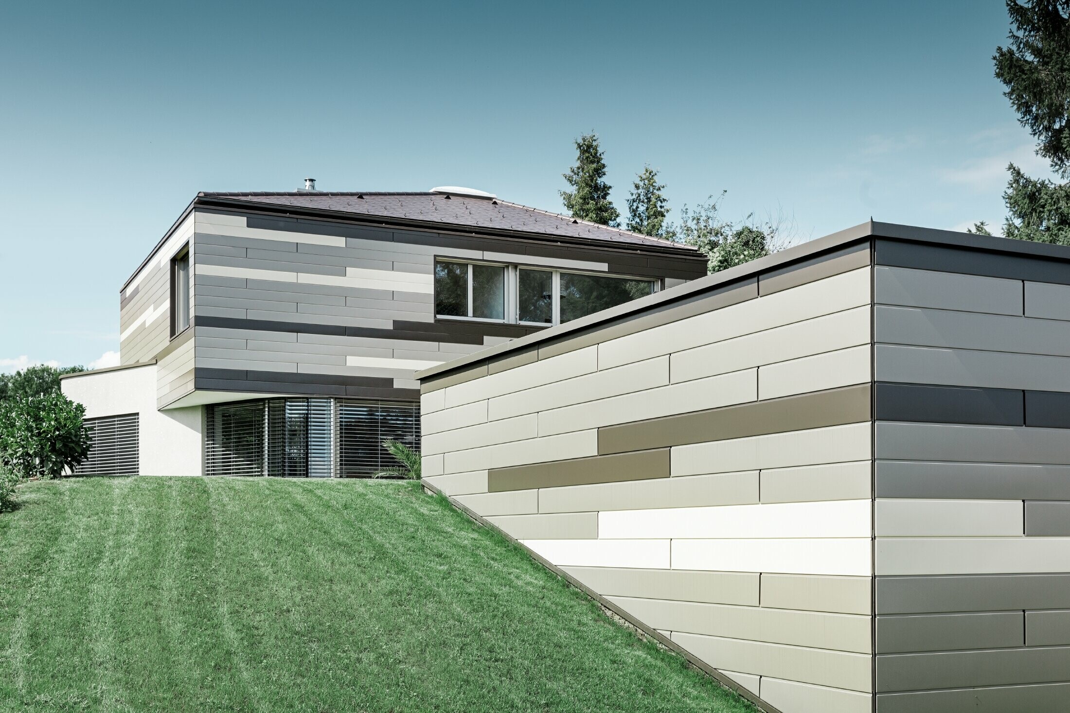 Le doghe per facciate PREFA sono dei classici nella realizzazione della facciata sia tradizionale sia moderna. Questi pannelli per facciata in alluminio di alta qualità possono essere posati in verticale, in orizzontale o in diagonale e sono realizzati come facciate a cortina retroventilate. Ciò significa che tra la struttura portante e la facciata in alluminio PREFA si trova un piano di retroventilazione nel quale l'aria può circolare. Qui troverai maggiori informazioni sulla facciata retroventilata.