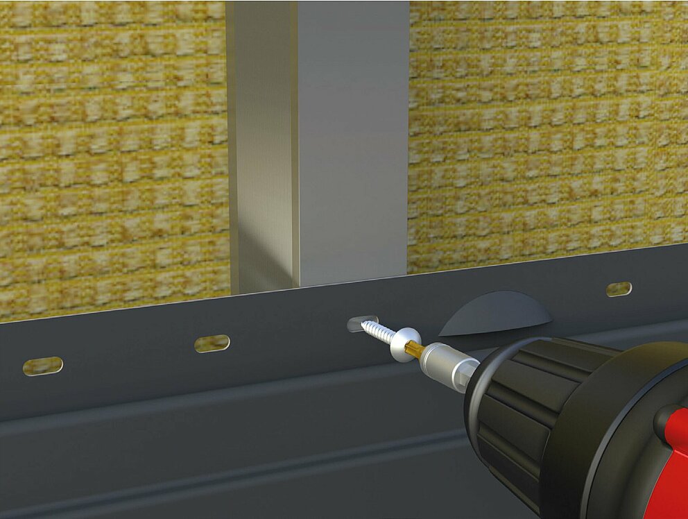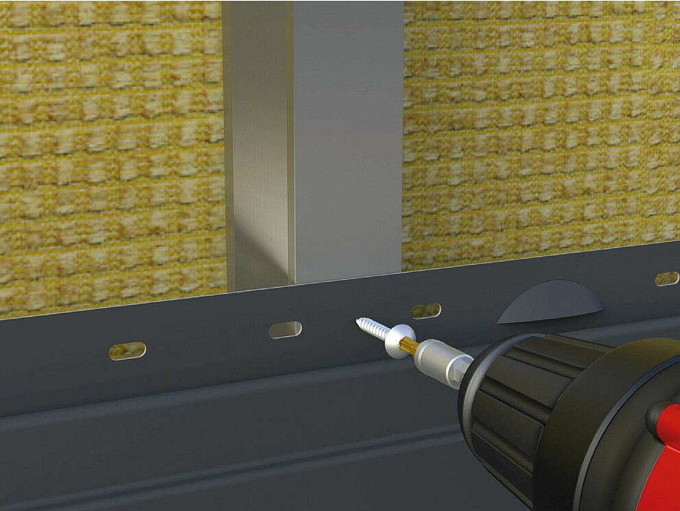 La vite di fissaggio viene avvitata centralmente attraverso il foro asolato preforato sulla linguetta di fissaggio nel profilo portante. Se non c'è un foro asolato preforato direttamente sopra un profilo portante della sottostruttura, è necessario realizzare un foro asolato, per esempio con l'aiuto di una pinza per fori asolati, per consentire alle Doghe di dilatarsi senza vincoli.