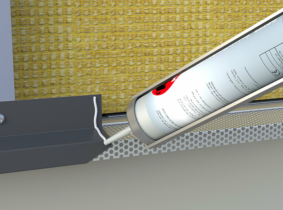Una volta completata la sottostruttura, si inizia con il montaggio del listello a innesto, della bandella di copertura, del nastro forato e del gocciolatoio. Il giunto del gocciolatoio viene formato per sovrapposizione e incollato. Il gocciolatoio (nascosto) sottostante viene ritagliato in modo da poter montare il gocciolatoio soprastante.
