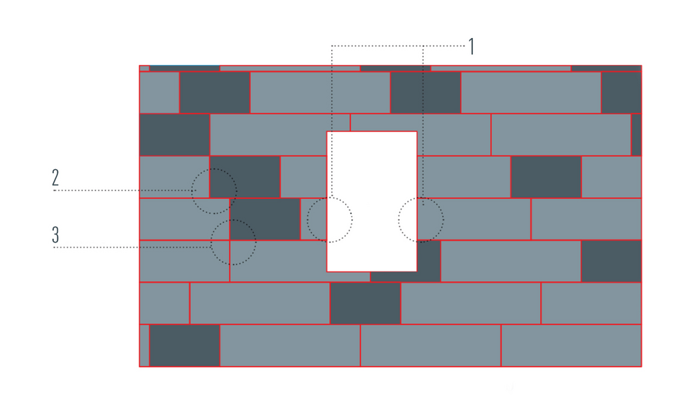 Un pannello FX.12 tagliato è stato riutilizzato sull'altro lato dell'apertura (1). In questo modo non è più garantito il mantenimento del passo corretto dei giunti (2) e, nel caso peggiore, ciò può portare alla sovrapposizione dei giunti (3). Per questo motivo sono stati creati degli esempi di posa che prevedono uno sfalsamento ottimale dei giunti.
