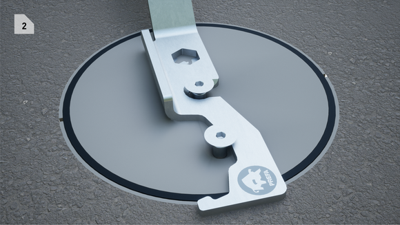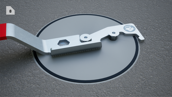 - Aprire il coperchio bloccabile (2 viti): Svitare di circa 1 cm le viti con una chiave a brugola da 6 mm, continuare a girare la vite centrale finché non si avverte più alcuna resistenza, quindi inserire il dispositivo di sollevamento, ruotarlo di 90° ed estrarlo
