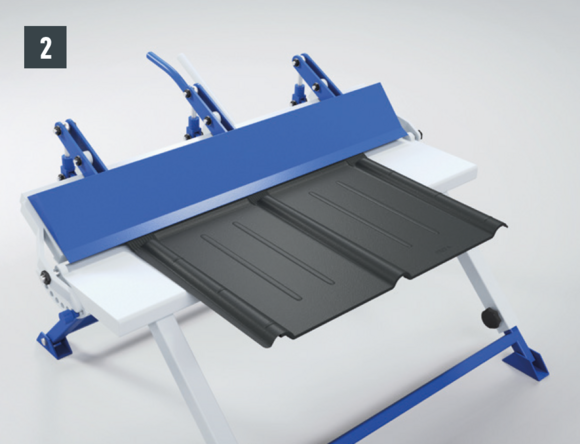 La nervatrice PREFA e la piegatrice PREFA (fig. 1 e 2) consentono una lavorazione facile e veloce delle lastre per scossaline di colmo, displuvio e di collegamento.