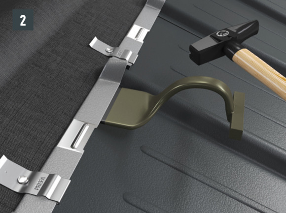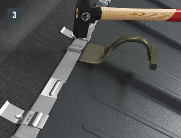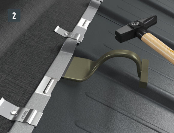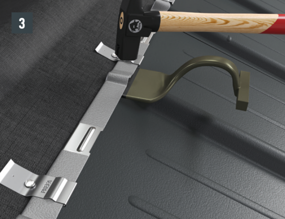 • Spianare la scanalatura a colpi di martello (fig. 3) per creare un'aggraffatura aperta uniforme. Non è necessario praticare un'incisione nel punto di giunzione delle tegole. Ora è possibile agganciare la parte anteriore (grembiule) senza problemi.