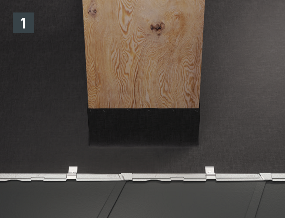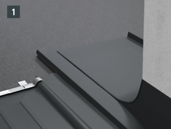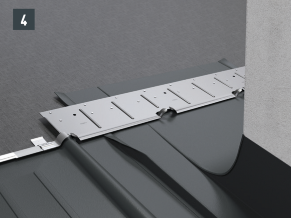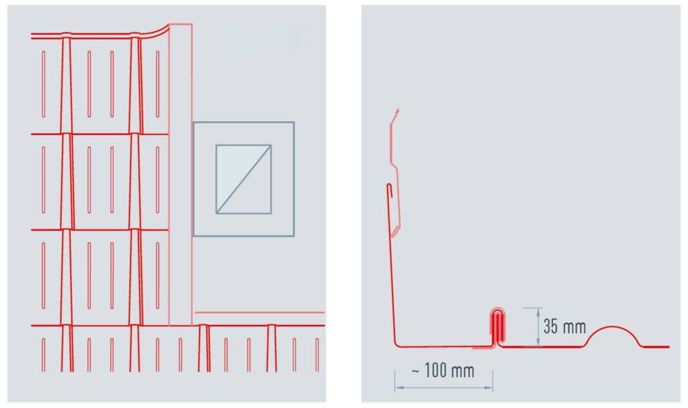 • Dopo aver preparato la copertura, è possibile realizzare le scossaline laterali e integrarle nella copertura. Fissare gli elementi laterali alla sottostruttura per mezzo di graffette di ritorno.