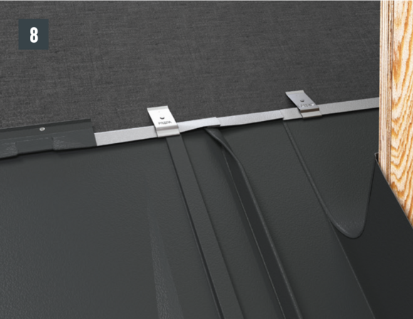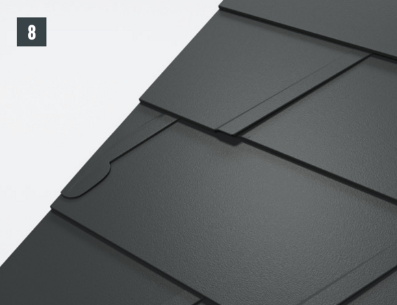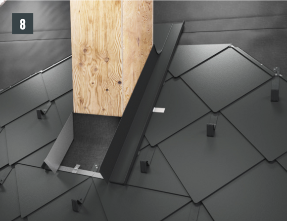 • Dopo aver preparato le scaglie, è possibile realizzare le scossaline laterali e integrarle nella copertura. Fissare gli elementi laterali alla sottostruttura per mezzo di graffette di ritorno (fig. 8).
