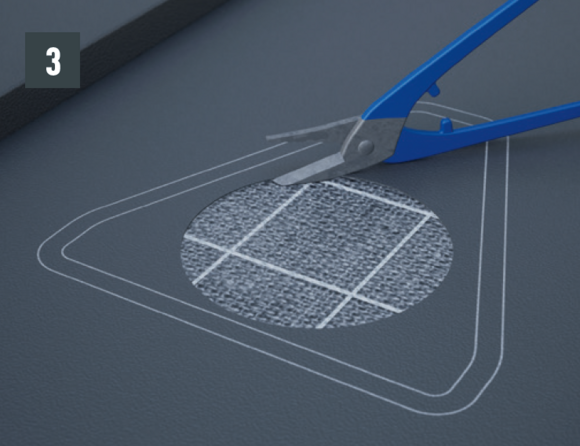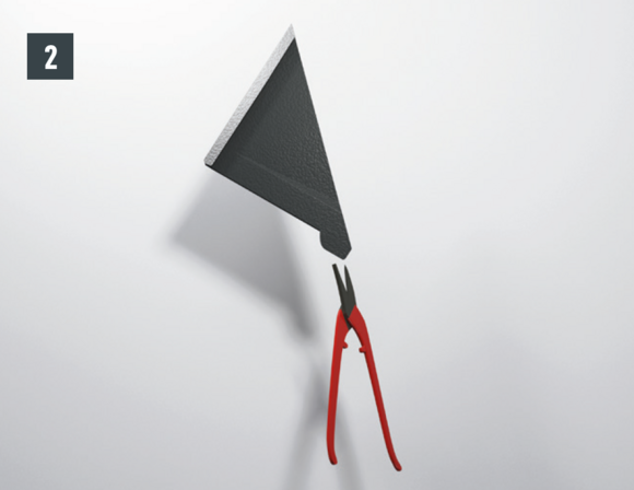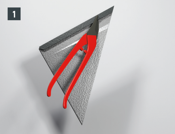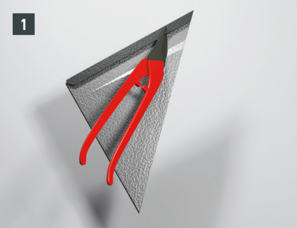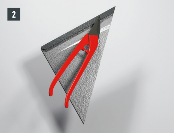 • Tagliare la scaglia 29 × 29 oppure 44 × 44 sul margine dell'aggraffatura e fare una tacca sull'aggraffatura (Fig. 2).