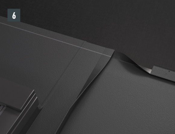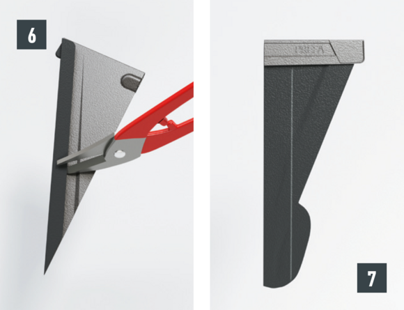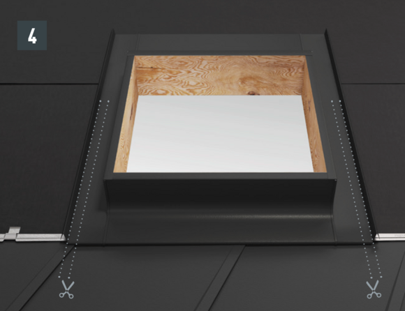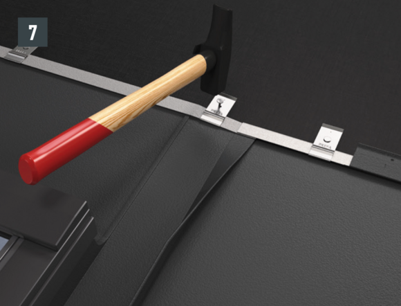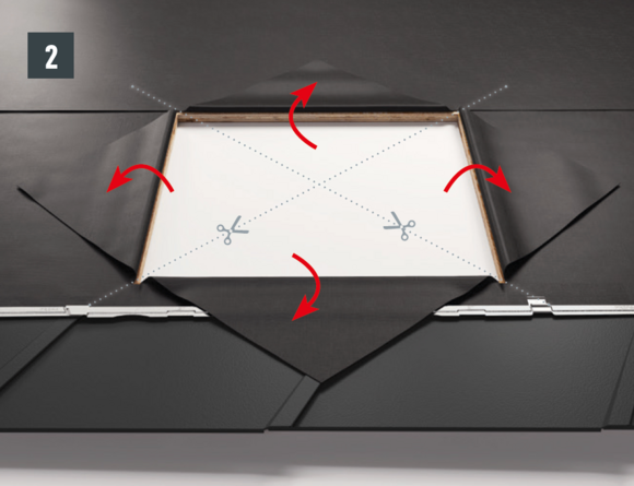 • Tagliare l'elemento posteriore della scossalina per lucernario in linea con la copertura PREFA, ripiegarlo e fissarlo con graffette di fissaggio (fig. 6 + 7).