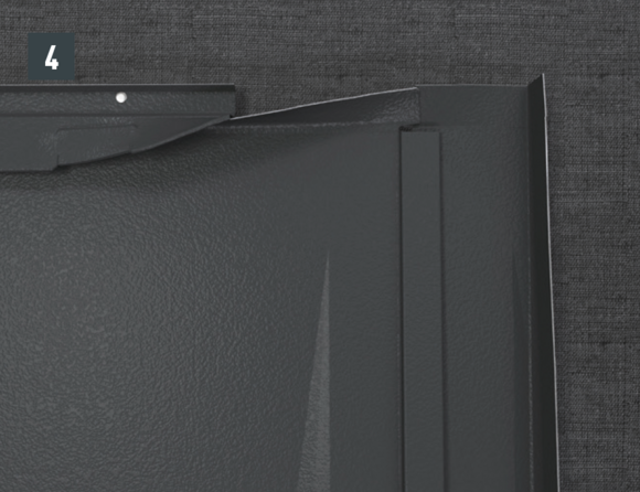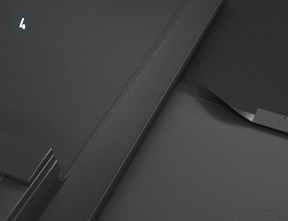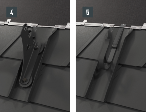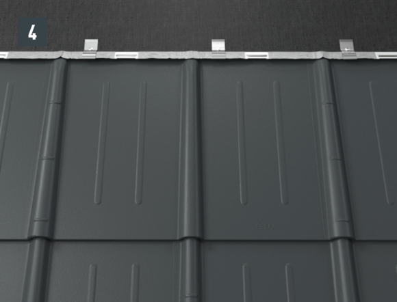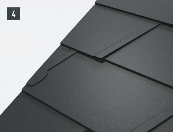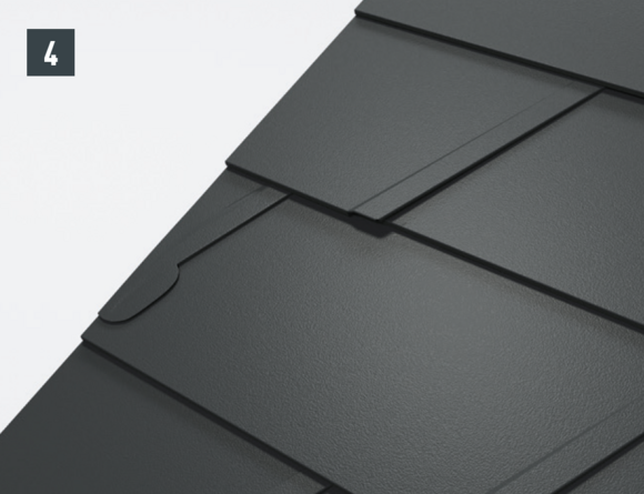 • Aprire la bordatura superiore della lastra di copertura PREFA e sollevare la sporgenza laterale di 90°. Poi inserire l'elemento posteriore (fig. 4).