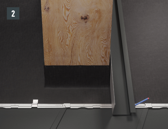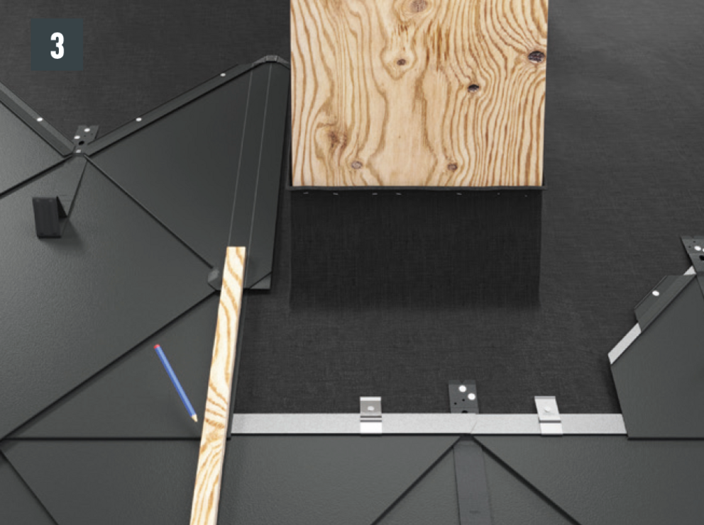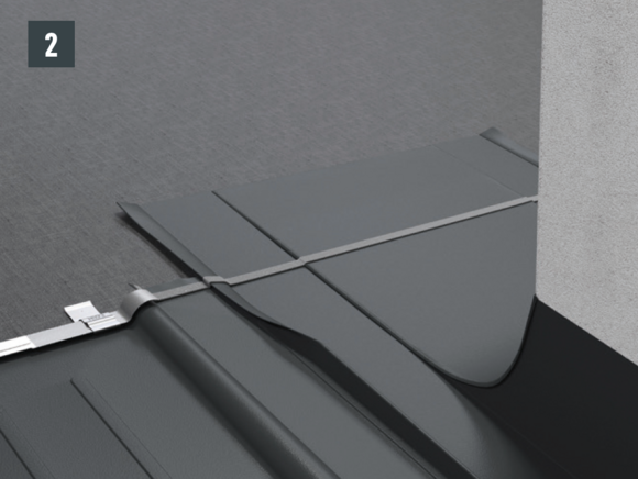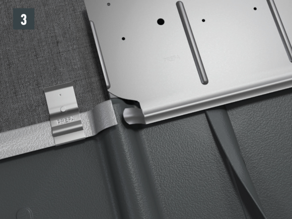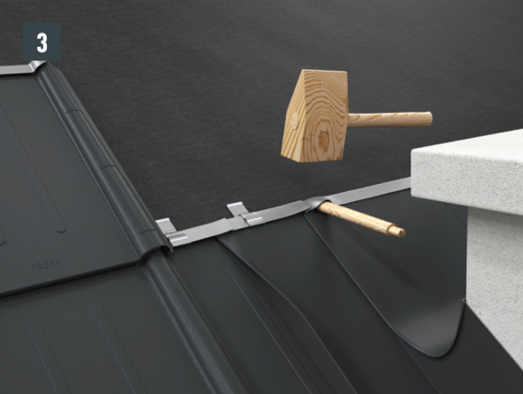 • Posizionare la sottopiastra nei 30 mm di copertura PREFA rialzata e chiudere le aggraffature e le graffette di ritorno su entrambi i lati. Posare verso l'esterno l'aggraffatura laterale all'estremità superiore, ripiegarla e fissarla lungo la copertura PREFA (Fig. 3).