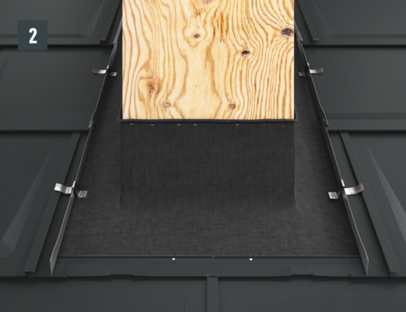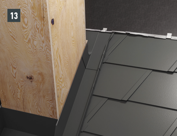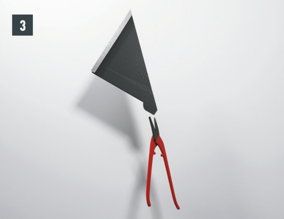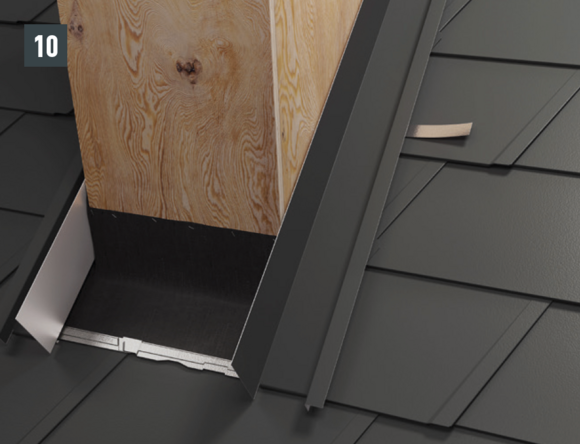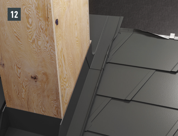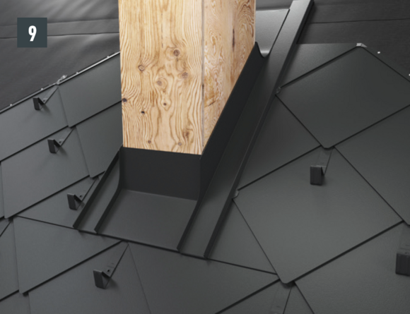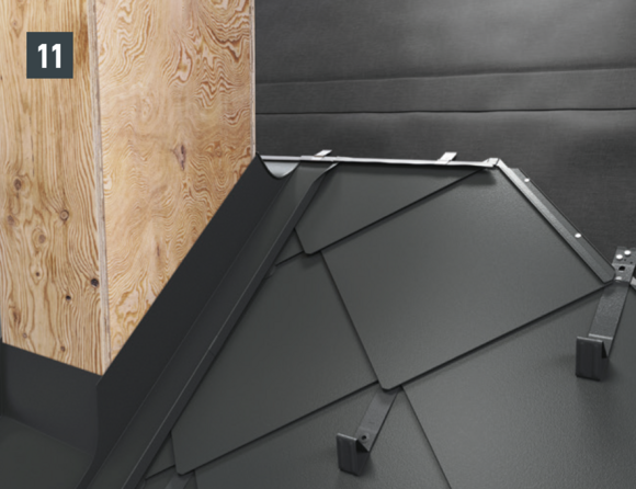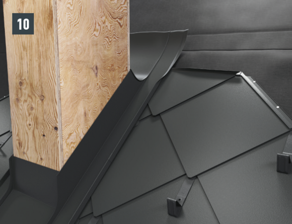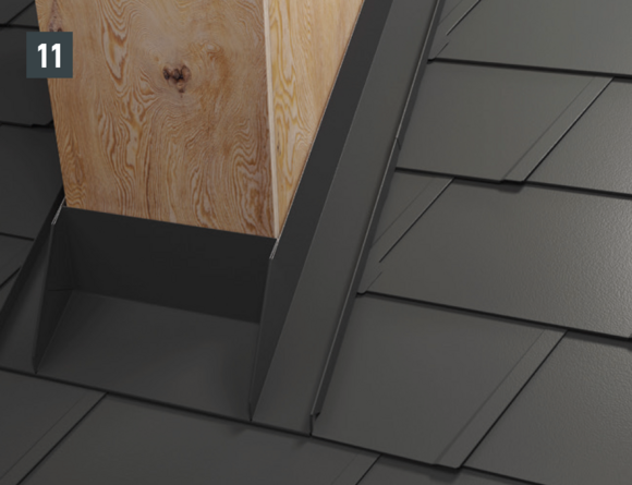 Ripiegare le aggraffature verticali degli elementi laterali nella zona superiore (fig. 10) e rifilare l'elemento posteriore e gli elementi laterali con un margine di 30 mm (fig. 11). Realizzare la bordatura: sopra la conversa si possono ora montare le scaglie di partenza per scaglie 29 × 29 o 44 × 44 e continuare la copertura della superficie del tetto.
