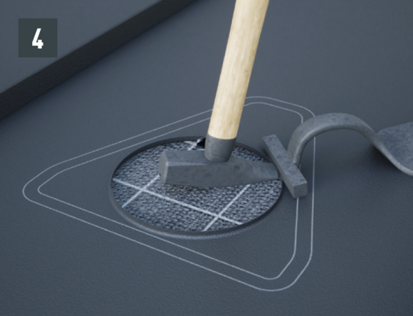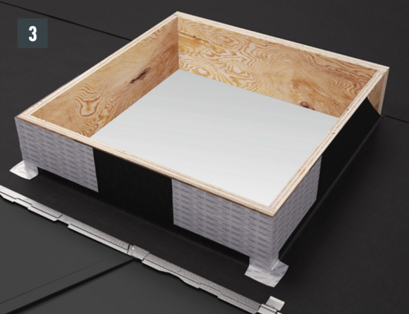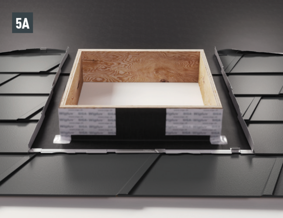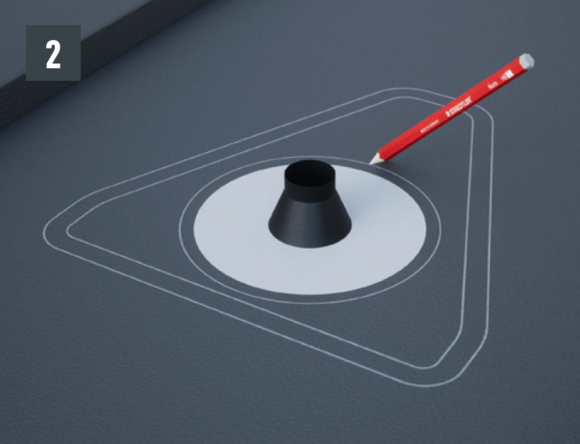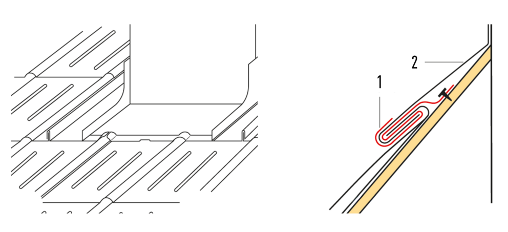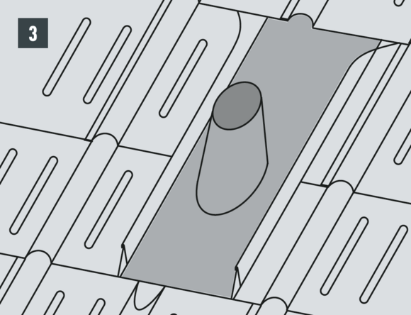 Il tavolato e lo strato separatore devono essere tagliati in base alla sezione di ventilazione (~10 cm di diametro). La copertura del tetto deve essere dotata di un rialzo di 1 cm di altezza intorno all'area del bordo dei ritagli.