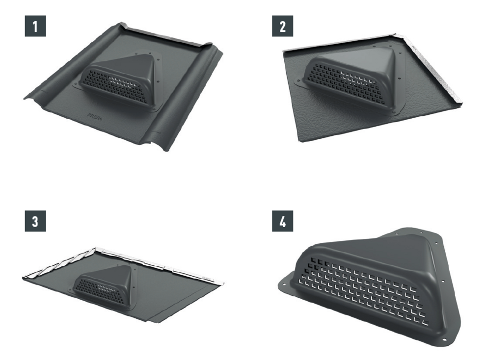 La conversa per scaglia 29 × 29 (1), la scaglia 44 × 44 (2), la tegola R.16 e il pannello per tetto FX.12 (3) e la scandola DS.19 (4) hanno le dimensioni del corrispondente sistema per copertura PREFA e possono essere inserite facilmente nella copertura.