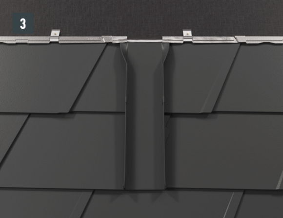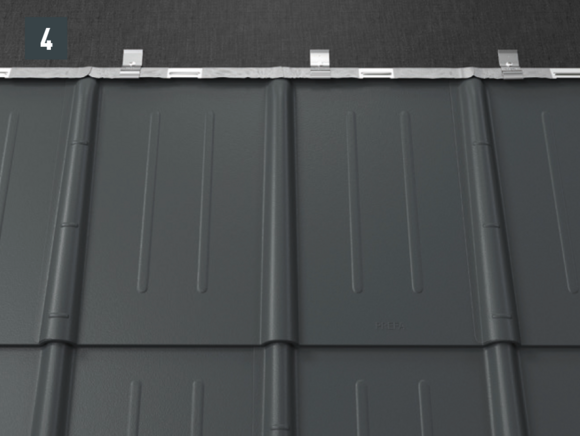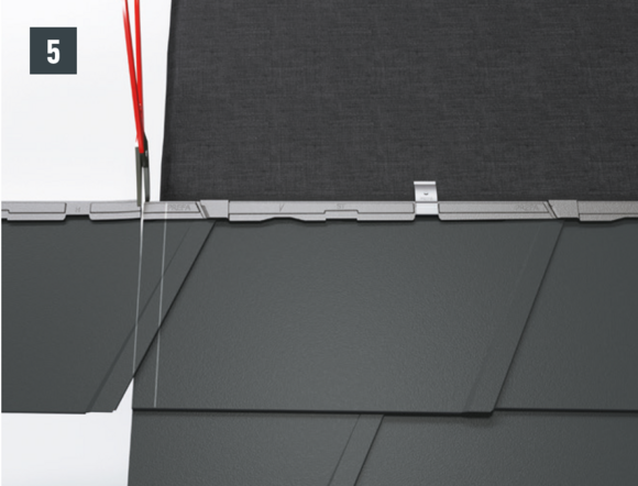Dopo aver montato le tegole, fino alla posizione desiderata della scossalina per lucernario, allineare la bordatura superiore della tegola in modo che sia possibile agganciare la parte anteriore della scossalina per lucernario PREFA.