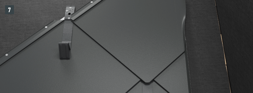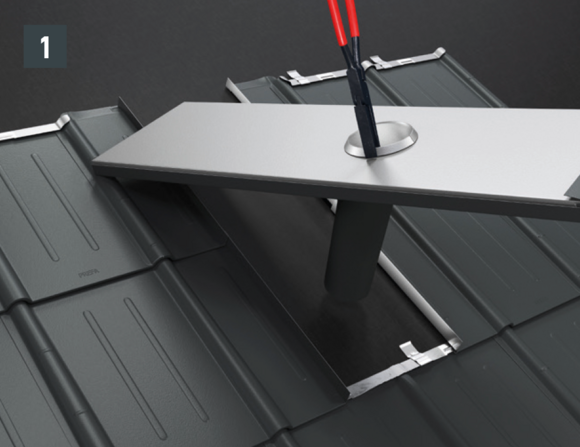 Dopo aver montato le tegole, fino alla posizione desiderata del passo uomo, allineare la bordatura superiore della tegola in modo che sia possibile agganciare la parte anteriore del passo uomo.