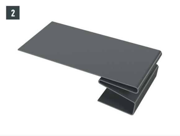 • Ripiegare verso l’alto la copertura PREFA di 30 mm su entrambi i lati in base alla larghezza della sottopiastra. In caso di necessità, si può montare una graffetta di ritorno per un fissaggio supplementare (Fig. 2).