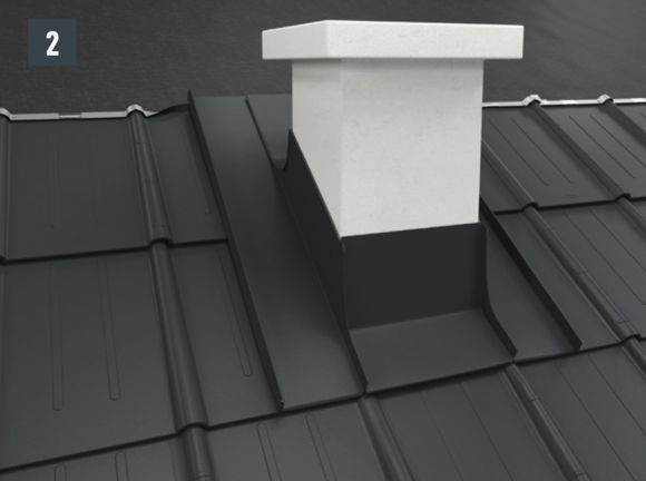 Fare arrivare le tegole R.16 o i pannelli FX.12 tanto in alto da riuscire a coprire tutta l'ultima fila di elementi di copertura PREFA sotto il camino.