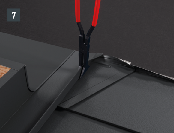 • Dopo il taglio delle aggraffature diagonali, le scaglie vengono ripiegate verso l'alto di ca. 30 mm in corrispondenza dei raccordi laterali (fig. 7). Una realizzazione a regola d’arte garantisce la tenuta alla pioggia.