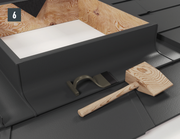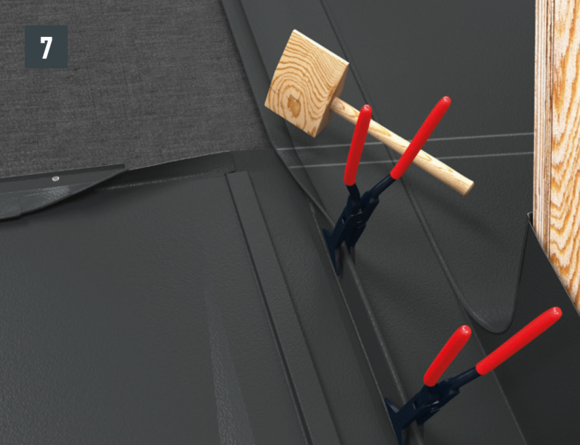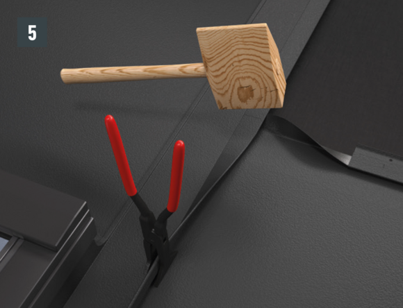 • Spianare la scanalatura a colpi di martello per creare un'aggraffatura aperta uniforme. Non è necessario praticare un'incisione nel punto di giunzione delle lastre (fig. 3).