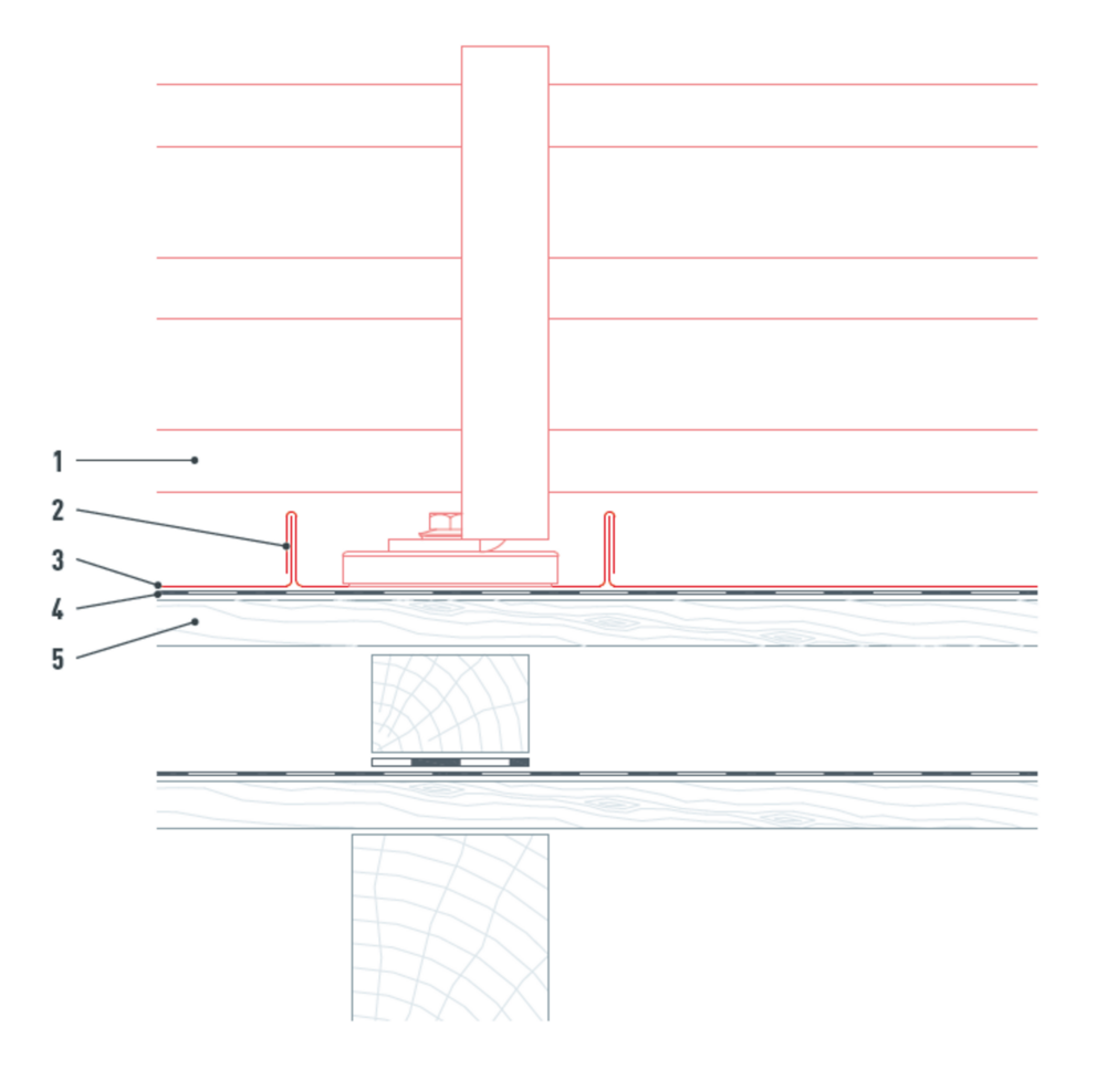 La base per l'installazione di un impianto fermaneve a tubi, di un gradino singolo, di staffe per la sicurezza sul tetto o per altri accessori può essere una sottopiastra, ad es. se un'aggraffatura o un'onda si trovano nella zona del puntone. Non fissare il prodotto PREFA in questione sull'aggraffatura o sull'onda di un elemento di copertura PREFA.