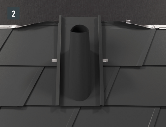 Se non è possibile far scorrere la conversa a causa della forma e delle condizioni della penetrazione (ad es. parabola o antenna), si può usare una conversa universale in due parti. L'inserimento nella copertura viene fatto in maniera analoga alla conversa da aggraffare tramite aggraffature.