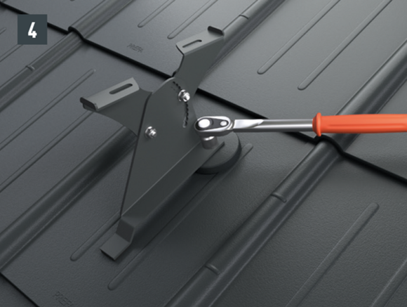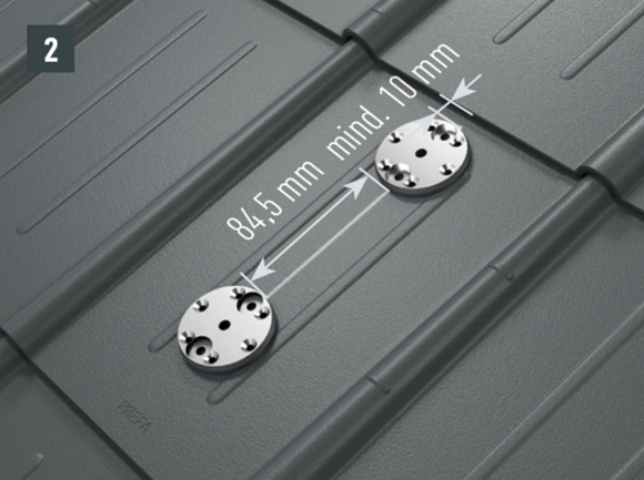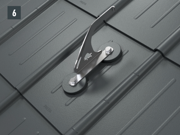 Non fissare il piedino sull'aggraffatura o sull'onda di un elemento di copertura PREFA. Può essere necessario montare una sottopiastra (ad es. se un'aggraffatura o un'onda si trovano nella zona del puntone).