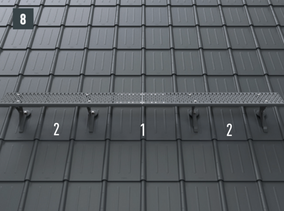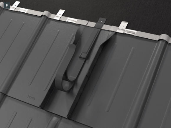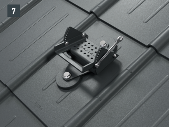 Si devono rispettare le istruzioni di posa PREFA, le norme vigenti e gli standard di settore. Le staffe di sicurezza anticaduta devono essere montate centralmente nel puntone utilizzando le viti in dotazione.