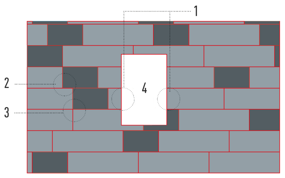 Un pannello FX.12 tagliato è stato riutilizzato sull'altro lato (4) dell'apertura (1). In questo modo non è più garantito il mantenimento del passo corretto dei giunti (2) e, nel caso peggiore, ciò può portare alla sovrapposizione dei giunti (3). Per questo motivo sono stati creati degli esempi di posa che prevedono uno sfalsamento ottimale dei giunti.