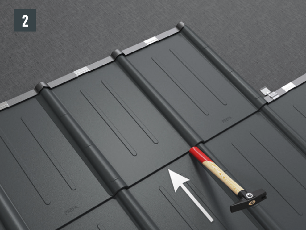 Spingere la tegola nell'aggraffatura per la staffa. Picchiettare leggermente il bordo inferiore della tegola con il manico del martello.