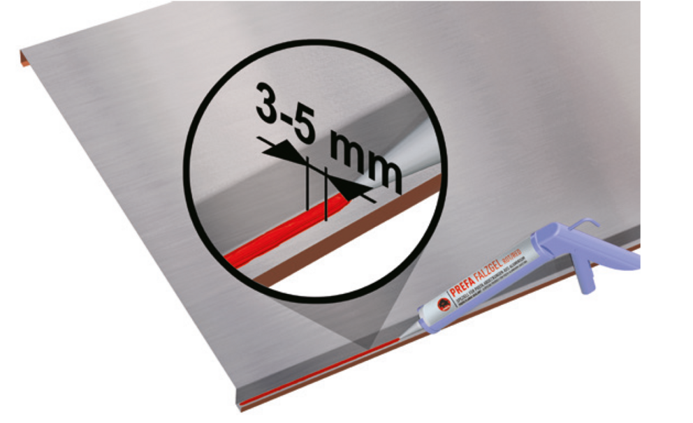 Quanto più bassa è la pendenza, tanto più alto è il rischio che l’acqua, sotto forma di pioggia, neve, eventualmente anche acqua di ristagno, possa penetrare attraverso l'aggraffatura sotto la copertura metallica. Con una pendenza del tetto fino a 7° è quindi necessario adottare misure speciali per la tenuta, ad es. l’impiego del sigillante per aggraffature PREFA.