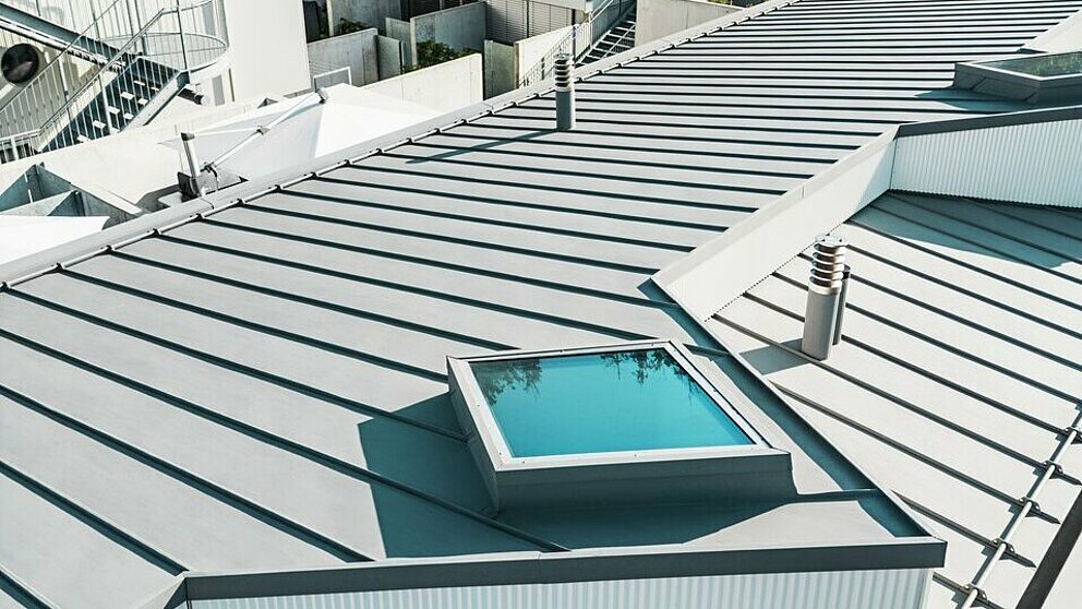 Per quanto riguarda il tetto complesso di 1.750 metri quadrati, era chiaro che i dettagli impegnativi potessero essere realizzati solo con la lamiera, poiché con altri materiali non sarebbe stato possibile ottenere una soluzione pulita ed esteticamente gradevole. Un'ampia campionatura con PREFALZ patina grigio ha convinto non solo i progettisti, ma anche il comune.