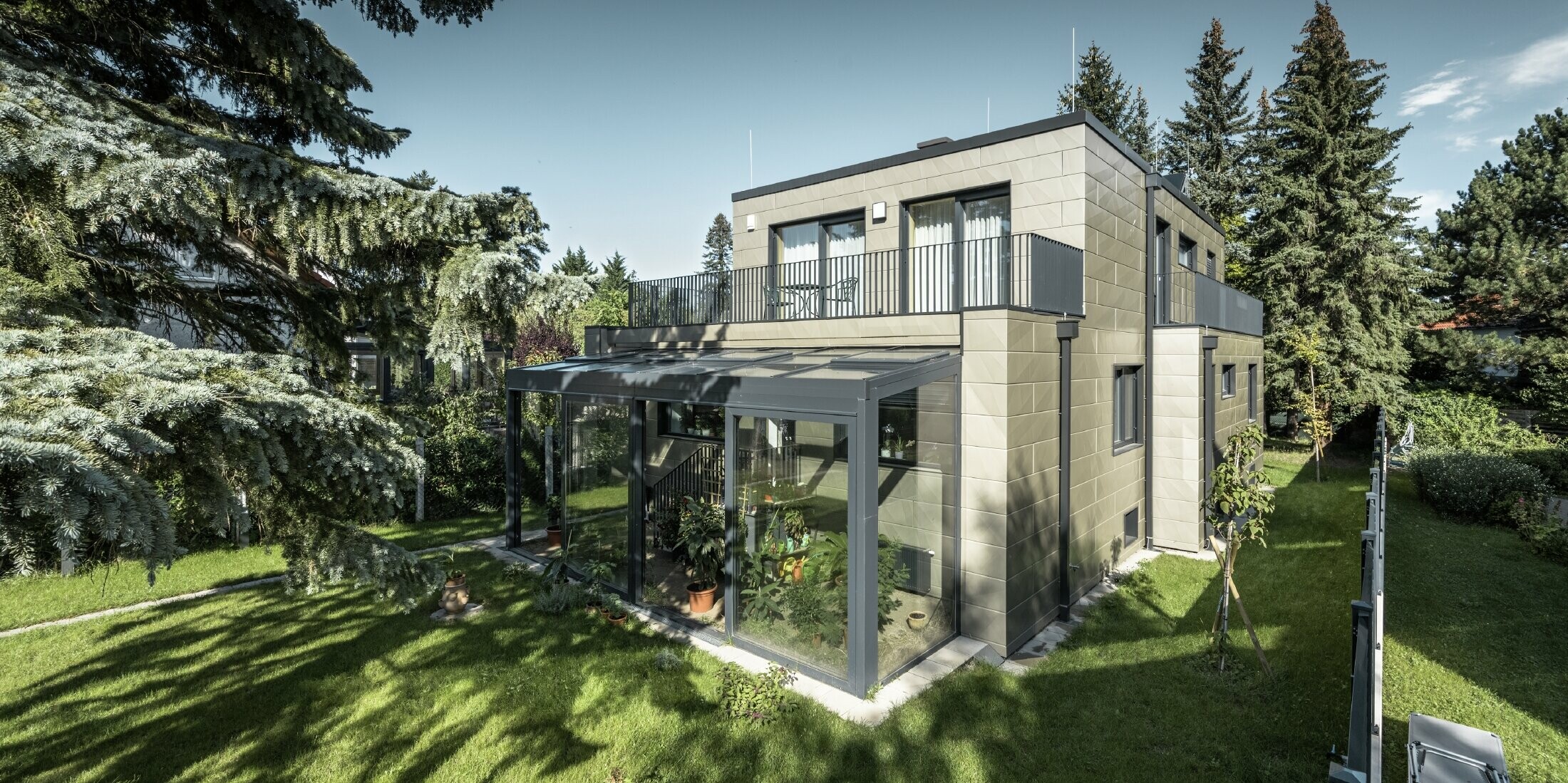 In questa moderna casa unifamiliare a Vienna, l’intera facciata è stata rivestita con Doga.X PREFA in bronzo. I dettagli, le cornici, gli elementi di testa e lo smaltimento acque (pluviale quadro PREFA) sono in antracite.