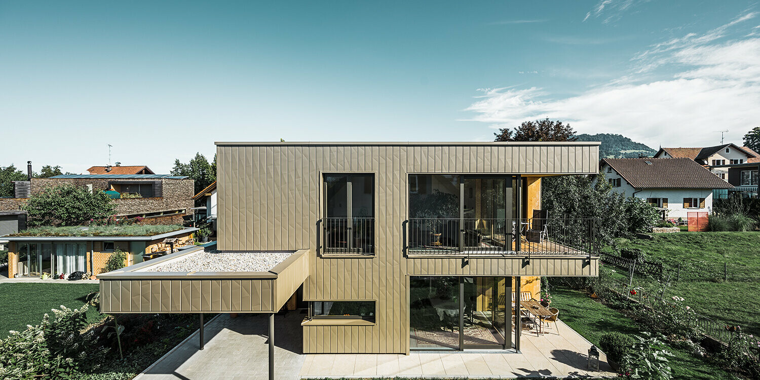 Per questa moderna casa unifamiliare sono stati utilizzati pannelli doga.X PREFA in bronzo montati verticalmente. Ad essi si abbina una facciata in legno nell'area dell'ingresso coperto.