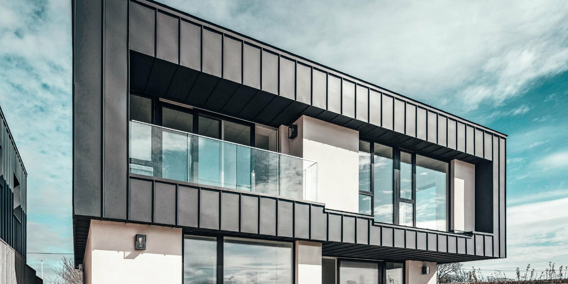 A Sutton, vicino a Dublino, tre moderni edifici residenziali a forma di blocco con pareti bianche e facciate scure con Prefalz in P.10 antracite sfidano dalla primavera 2019 le rigide condizioni meteorologiche della baia di Dublino.