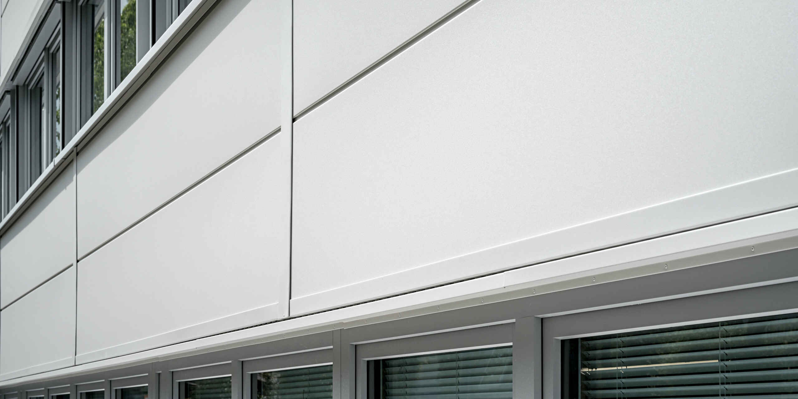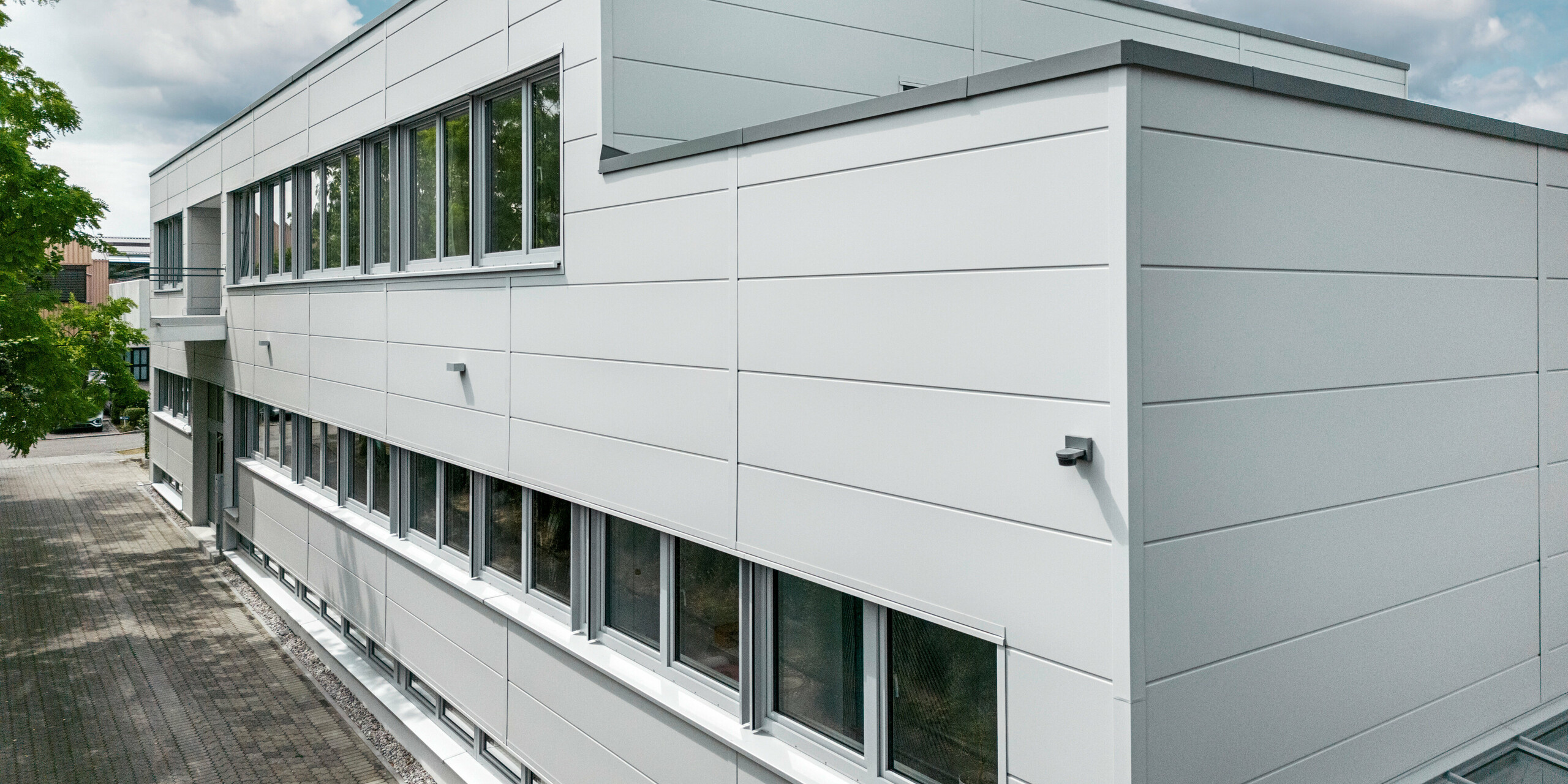 Questo complesso aziendale ad Oberschleißheim (Germania) è stato rivestito con doghe PREFA 600 di colore bianco Prefa.
