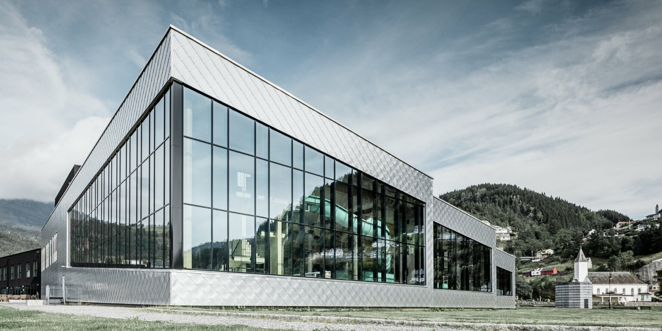 Ispirandosi ai metodi di costruzione tradizionali, gli architetti hanno utilizzato pietre di ardesia e casseforme in legno verticali. Gli edifici rappresentativi della zona erano coperti un tempo da lastre di ardesia a forma di rombo, che assomigliano a un tipo di pan di zenzero tipico della regione. LINK Arkitektur ha reinterpretato le forme della copertura tradizionale della facciata sul lato della riva con scaglie a rombo 44×44 di PREFA in alluminio naturale.